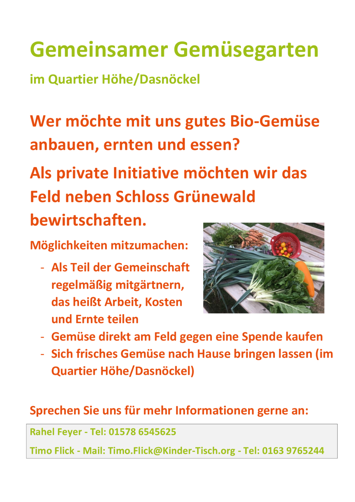 Immer samstags ab 10 Uhr gemeinsamer Garteneinsatz des Gemüsegarten Projektes auf dem Feld bei Schloss Grünewald. Interessierte sind herzlich eingeladen zum Mitgärtnern und Ernten.